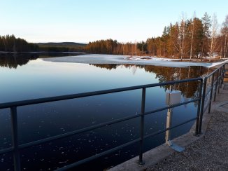 Wij wonen dicht bij de rivier de Öredalälven. Deze rivier komt vanuit de noorse bergen en stroomt het Siljan in. In Furudals bruk is een stuw die nu is open gezet. Daar gaat toch een bak water doorheen op dit moment.