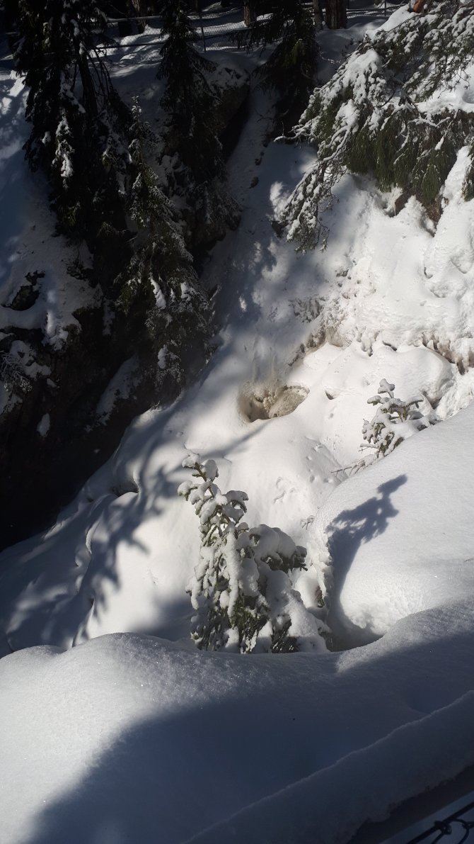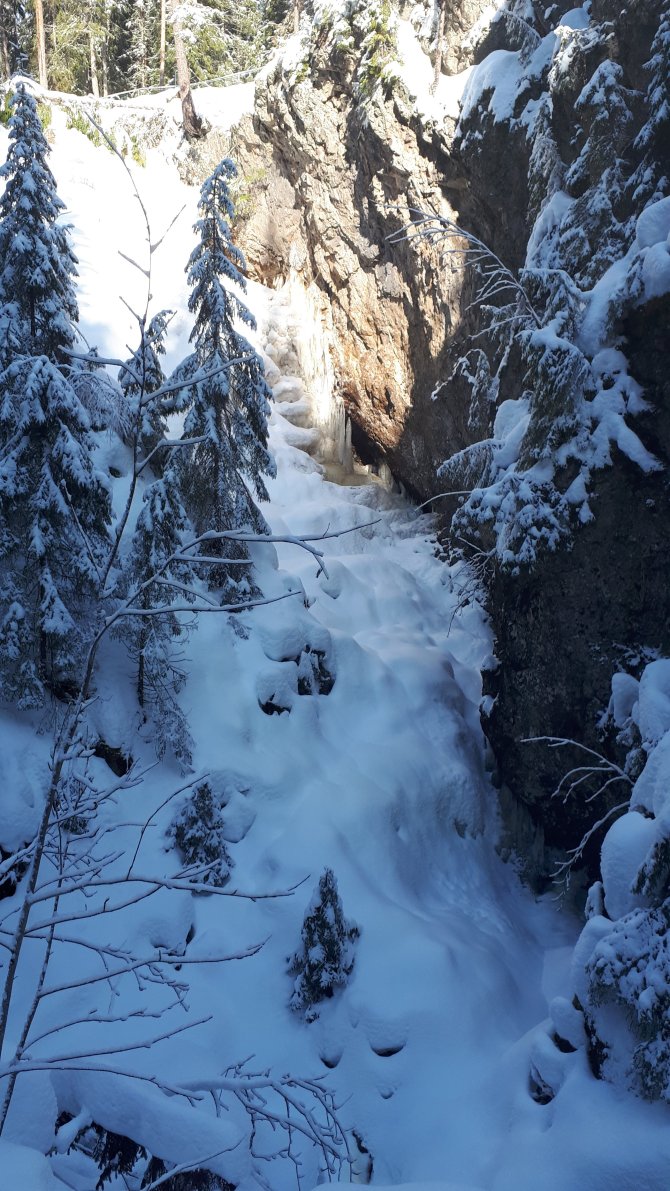 Vandaag wilden we kijken of we bij de waterval konden komen en of deze dan ook bevroren was. Antwoord…. ja het kon. Ja bevroren. Wel veel ploegen door de sneeuw om er te komen.