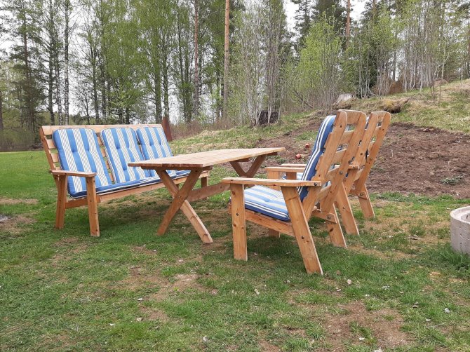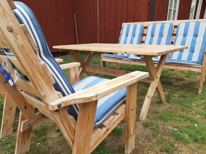 Tweede hands en hergebruik is helemaal hip hier. Echt iets wat je tegen Nederlanders moet zeggen… zuinig doen. En omdat we sinds deze week een aanhangwagentje hebben kunnen we helemaal mee in de strijd.Vandaag tuinmeubelen voor een prikkie. 2 stoelen, tafel en bank 1000 SEK. Nieuwe kussens erbij 300 SEK. Omgezet naar euro’s zien we er voor €130,- bijna alfa nieuw bij.Beetje scheuren… beetje in de verf en hopsa!Het zit nog lekker ook trouwens.