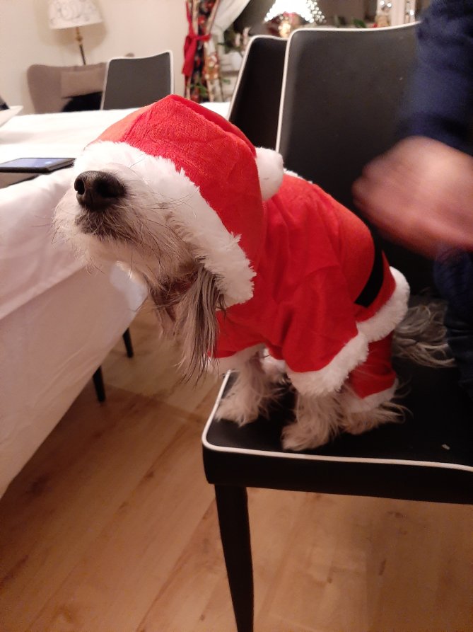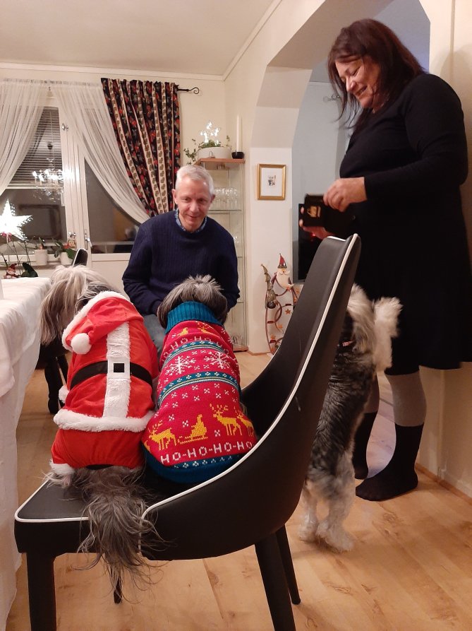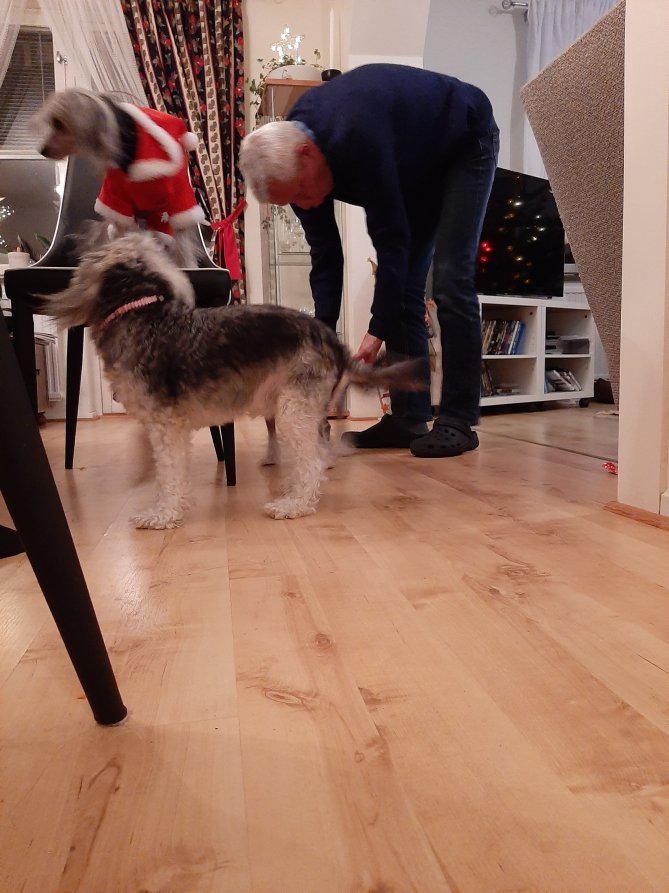 Wij zijn gisteren bij Mirian geweest, een collega. Zij had Braziliaans gekookt. Een makkie voor haar want daar komt ze vandaan. Heerlijk vis gegeten, spelletjes gedaan en de honden aangekleed in kerstsfeer.