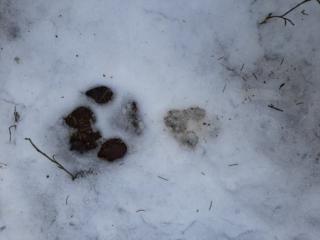 En dan dit… in een restje sneeuw. De afdruk van een berenpoot We zagen er meer. Op de foto is een poot van Boris en die van een beer te zien.