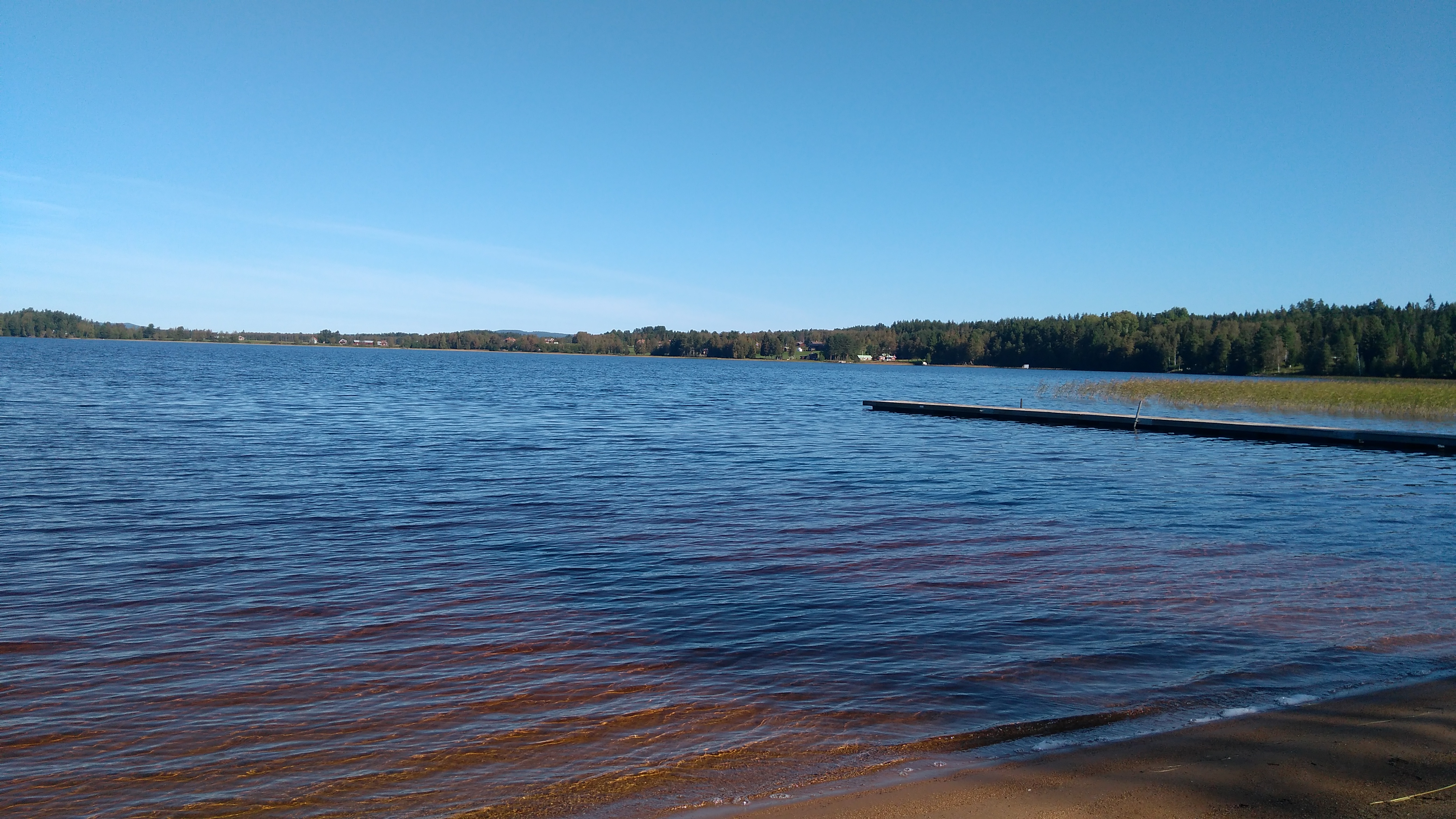 Even een klein inkijkje van hoe mooi het kan zijn. De herfst is echt wel aangekomen maar de zomer wil nog niet opgeven. Voordeel 3: je kunt helemaal alleen genieten van deze mooie zaken en dingen. Je komt ook nog kleine dieren tegen en een grote hond die Boris heet. Even een beeld geven van de kerk van Ore en aan de overkant van het meer wonen wij.