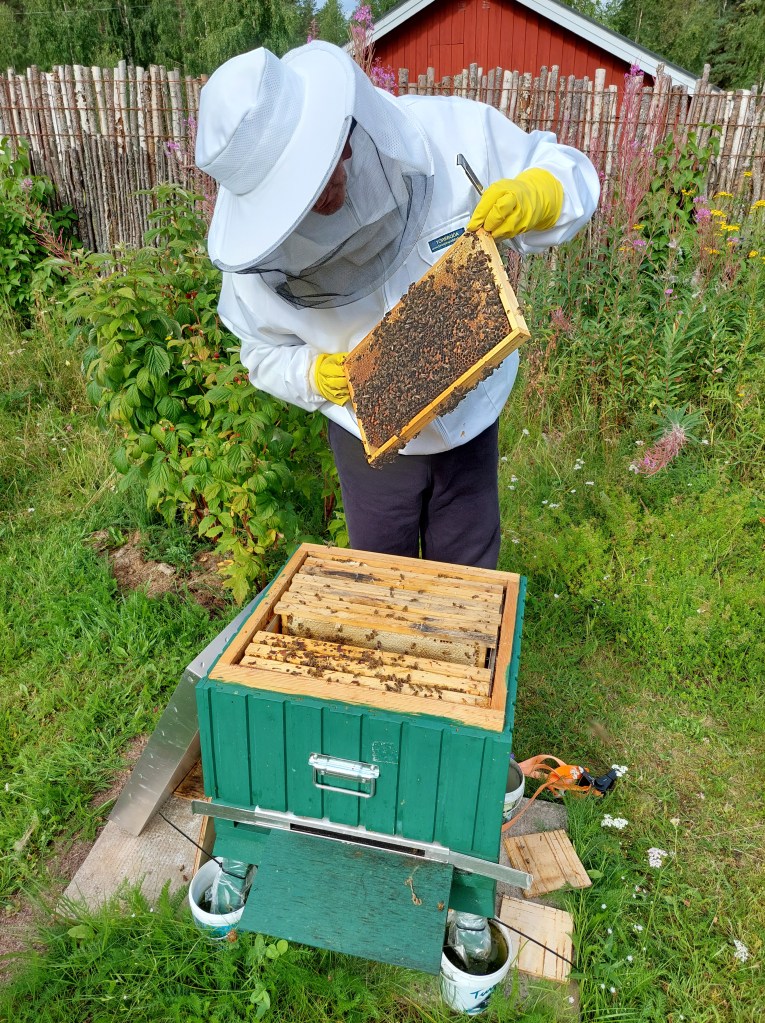 Richard heeft de bijen gecontroleerd en deze hebben erg hun best gedaan tijdens onze vakantie. Er zit flink wat honing in de kast en er zijn flink wat bijen bijgekomen. De koningin heeft dus flink haar best gedaan. Richard heeft haar nog niet gevonden.