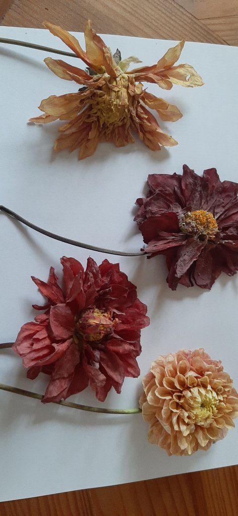 Hier gaat het dan om vier personen, een kok, een hovenier, een archtiect en een bloemist. Met elkaar knappen ze gezellig een tuin op een delen weetjedatjes. En van die weetjes was dat je bloemen kunt drogen met kattengrit. Dus hop, maar de winkel, 10 kilo aangeschaft en de dahlias gekortwiekt. Na een week zouden de bloemen droog zijn en dan “kan je de hele winter binnen genieten van je zomerbloemen”. En ik geloofde het ook nog. Vandaag de eerste bloemen opgegraven…