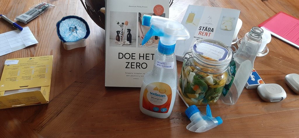 Vanochtend vroeg weer een poging gedaan onze voetstap minder groot te maken. We hebben een poging gedaan om eigen schoonmaakmiddelen te maken. Gewapend met twee boeken, azijn, bicarbonaat, marseillezeep, citrusvruchten en geurolietjes (uiteraard eco allemaal) zijn we aan de slag gegaan met allesreiniger, wc-reiniger en kalkverwijderaar als resultaat.