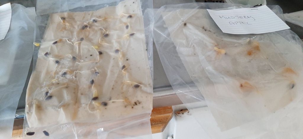 Het is zo’n bevredigende bezigheid in zaden op te kweken. Elke keer vind ik het weer spannend en boeiend wat er gebeuren gaat. We zijn nu op de helft van alle pitten. Tot nu toe komen er e ook ke dag een paar een steeds denk ik “dit zal wel de laatste zijn”. Maar nee dus… de eerste krijgt al zijn tweede blaadjes.
