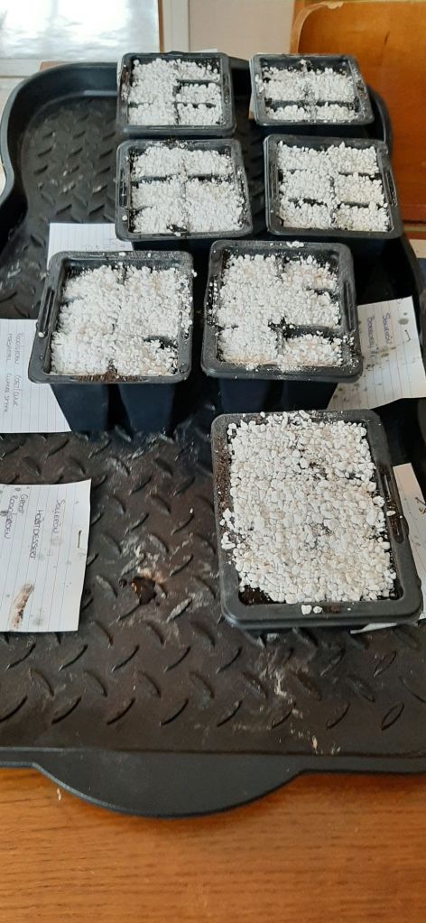 John is begonnen met het terras sneeuwvrij te maken zodat we buiten kunnen zitten. (Vandaag wordt er nog 20cm sneeuw verwacht wat de kans wel een stuk kleiner maakt). Ik ga straks beginnen aan het voorzaaien van de ‘oranje-bruine tuin’. Dat houdt in ongeveer 25 verschilde soorten vaste en 1-jarige planten voorzaaien die in de loop van het jaar kunnen worden uitgeplant. Omdat we naar een lagere klimaatzone zijn gegaan is er meer variatie mogelijk.
