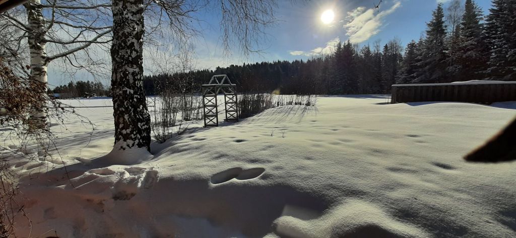 Gisteren is er zo’n 10 cm sneeuw gevallen op de toch al niet kleine hoeveelheid die er nog ligt. Maar vandaag kwam dan de zon na een lange tijd weer eens tevoorschijn, wat een mooi beeld geeft van onze toekomstige tuin. Dit wordt een lekker zonnige plek, zoveel is nu al duidelijk.