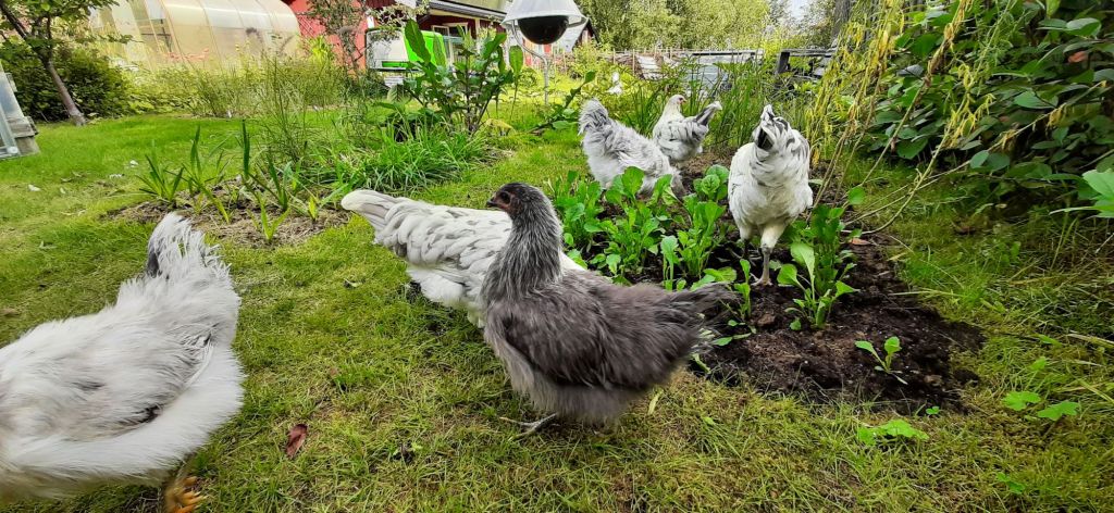 Na een lang debat besloten om de kippen toch maar los te laten in (een deel van) de tuin. Ze doen het goed met elkaar, blijven bij elkaar in de buurt en er is weinig ruzie.