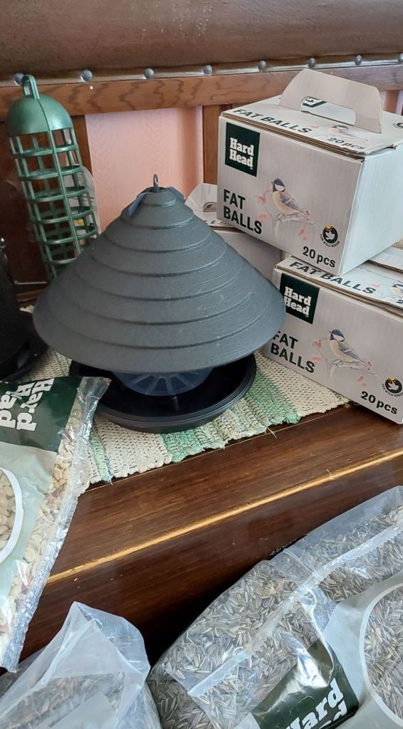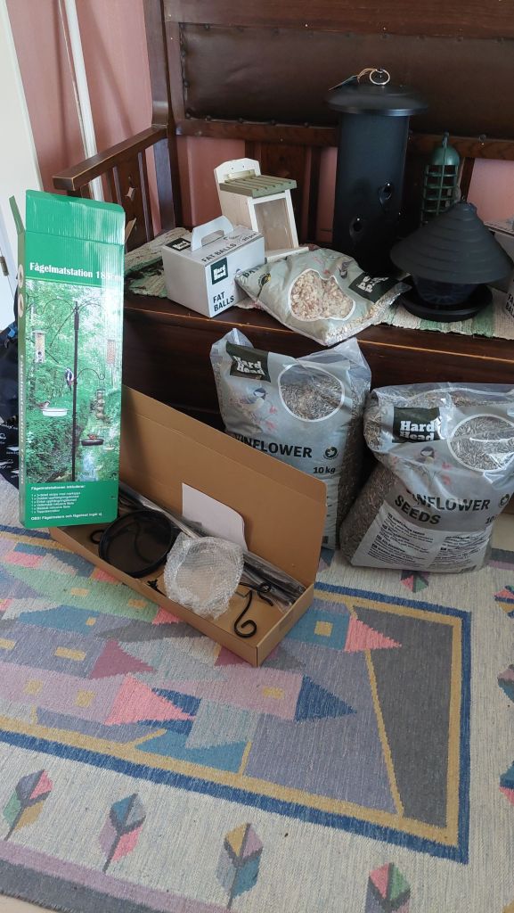 Om te beginnen 20 kilo zonnebloempitten, 80 vetbollen, pinda’s (maar die zijn voor de eekhoorn in haar nieuwe voederhuisje), een voederstation, twee voederhuisjes.