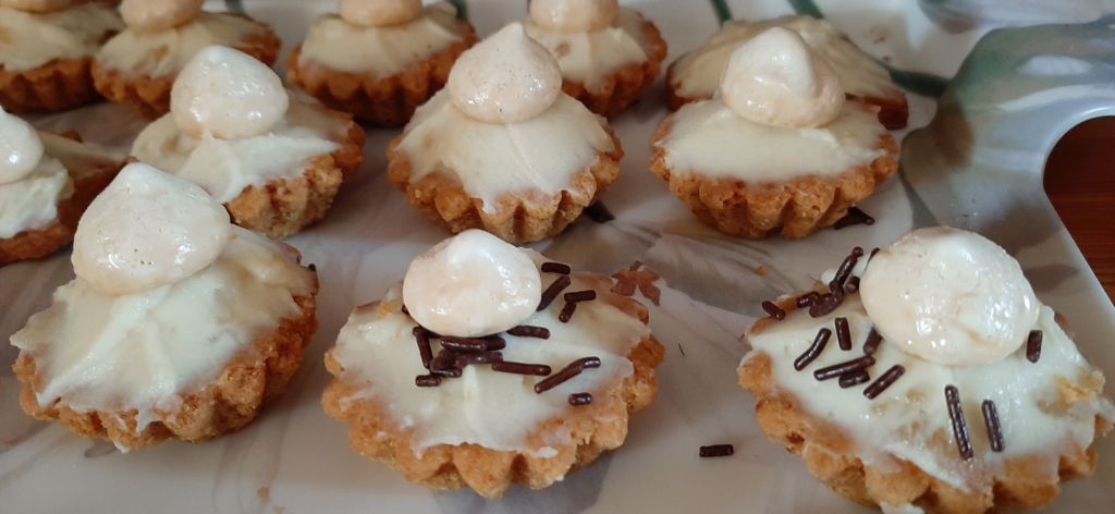 En dat is dan nog niet zo gemakkelijk. Het zandtaartje kwam niet uit de vorm, de vulling ging niet door de spuitzak en de merengue werd te bruin. Ze smaken overigens wel erg lekker. We hebben nu nog twee dagen de tijd om te besluiten wat we doen. Dit, of toch maar een ouderwetse appeltaart. Want die lukt altijd.