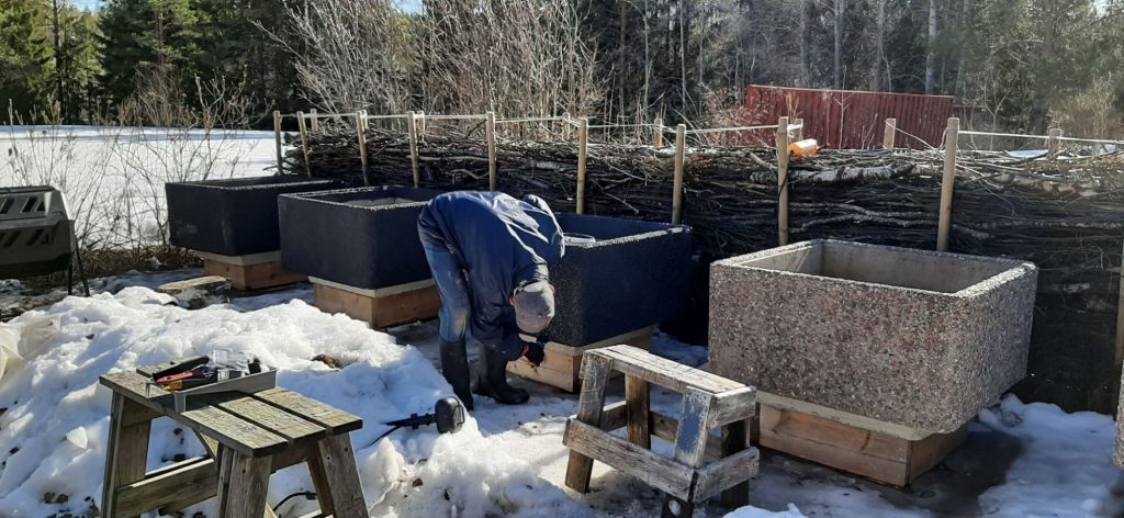 Heel stiekem zijn we vandaag aan het tuinieren geslagen. Natuurlijk weer veel te vroeg zoals ieder jaar maar het bloed begon te kruipen en kriebelen. Eerder in dit blog en post geplaatst over de moestuinbakken, vandaag zijn we begonnen met het verven ervan. Zo donker mogelijk zodat de grond in de bakken op kan warmen.